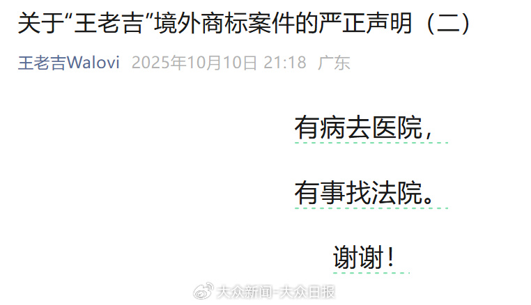 10日晚,认证主体为广州王老吉大健康产业有限公司的“王老吉Walovi”微信公众号发布《关于“王老吉”境外商标案件的严正声明(二)》,文中只有12字,“有病去医院,有事找法院。谢谢!”